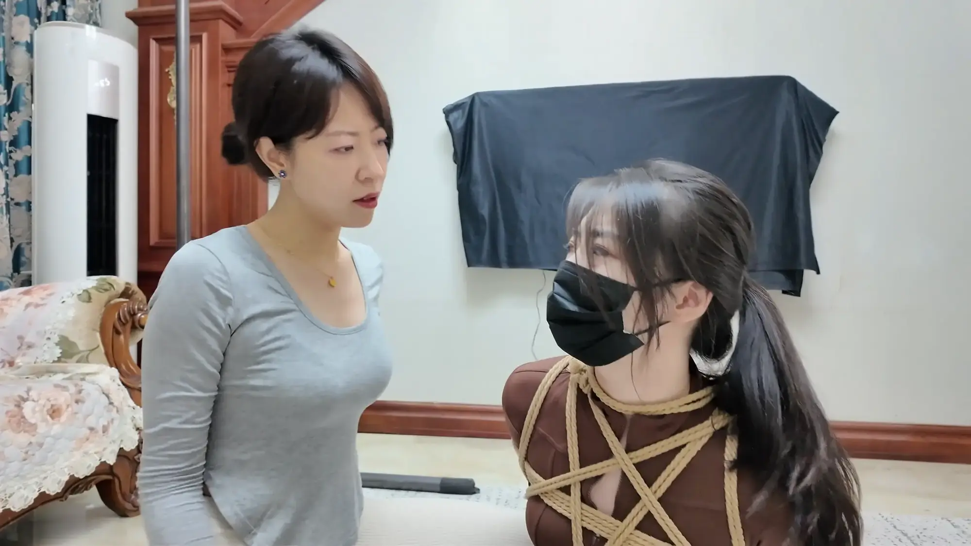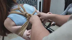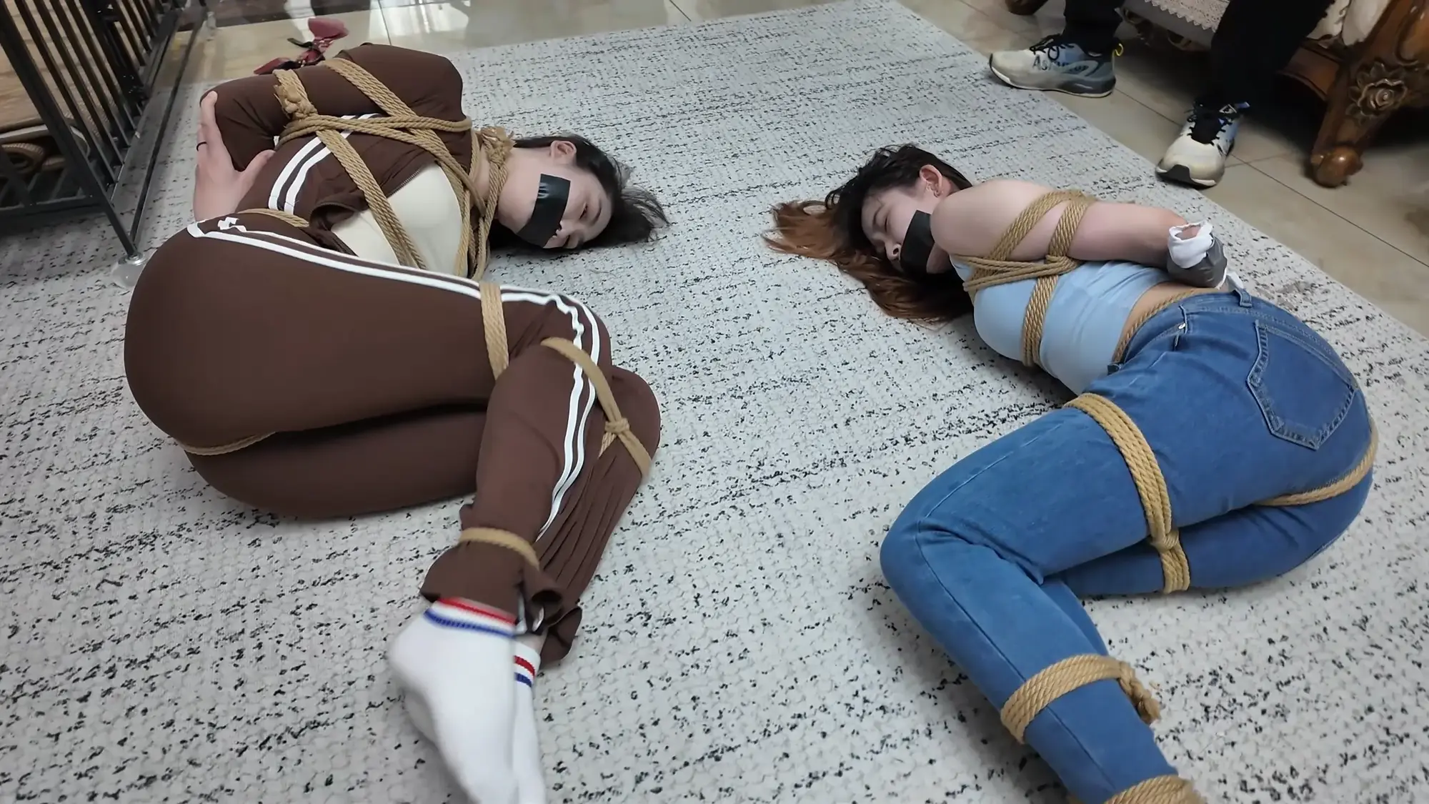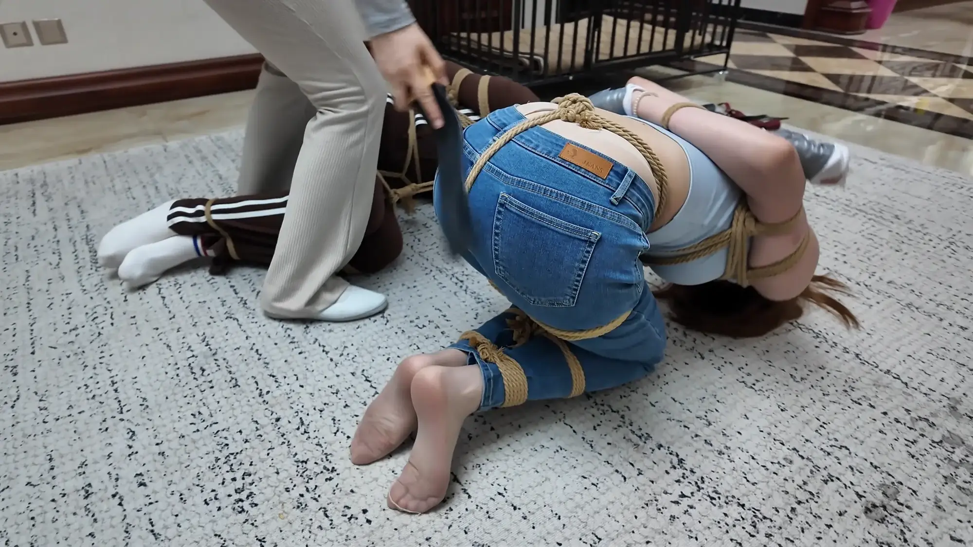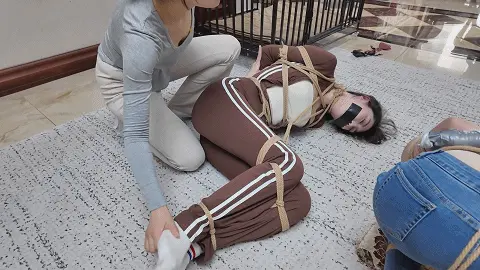 雨诺与南清一前一后被带到了囚禁她们的地方,一番挑逗后南清双手双腿也被紧密捆绑起来,雨诺也被团缚侧躺在地上,米粒开始肆意玩弄两人的身体,并时不时表示两人的身材很好,这次又能卖个好价钱,她先后拿道具抽打两人的身体,并用手挠两人的脚取乐,最后甚至用脚挑逗两人。玩累的米粒伸了伸懒腰,把男人叫出来表示自己要休息,让他看会儿两人。