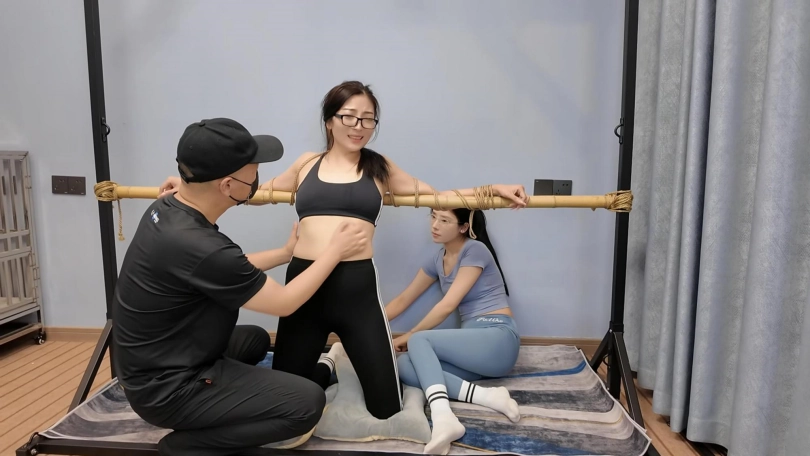 十一和男友把瑜伽教练诱骗到家里,迷晕玩弄,在客厅捆绑玩弄之后又带到密室里面,用麻绳打结拉下面,带上口球,两人一起上,一个挠胳肢窝,一个挠脚底,折磨的瑜伽教练控制不住失禁一大片