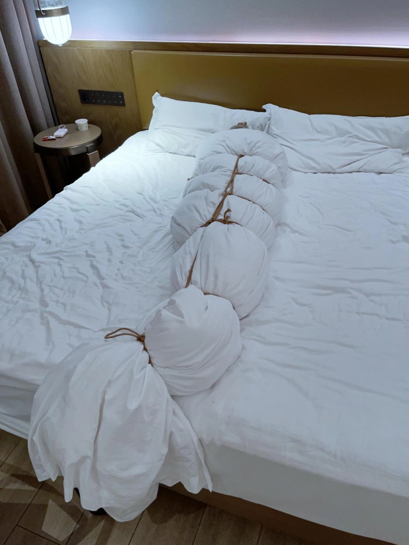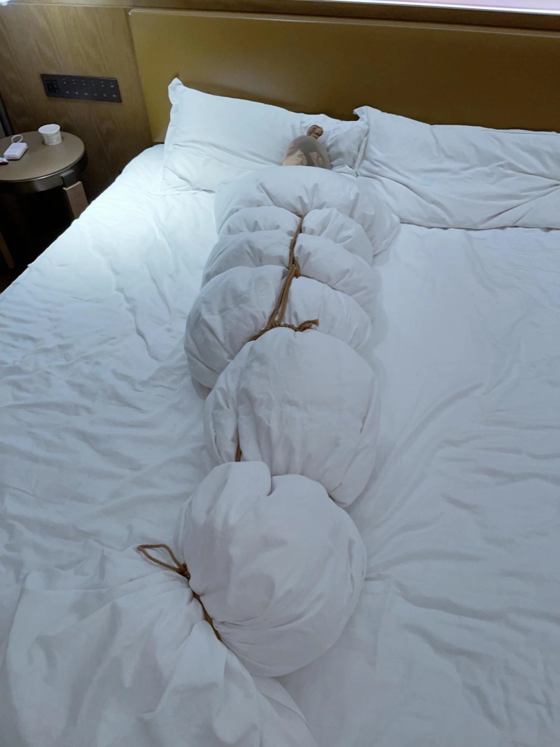 第五层拘束——绳网加固:用6道绳子组成绳网并在脚踝脚腕处打结扎紧。彻底变成棉被毛毛虫!只能蠕动了!