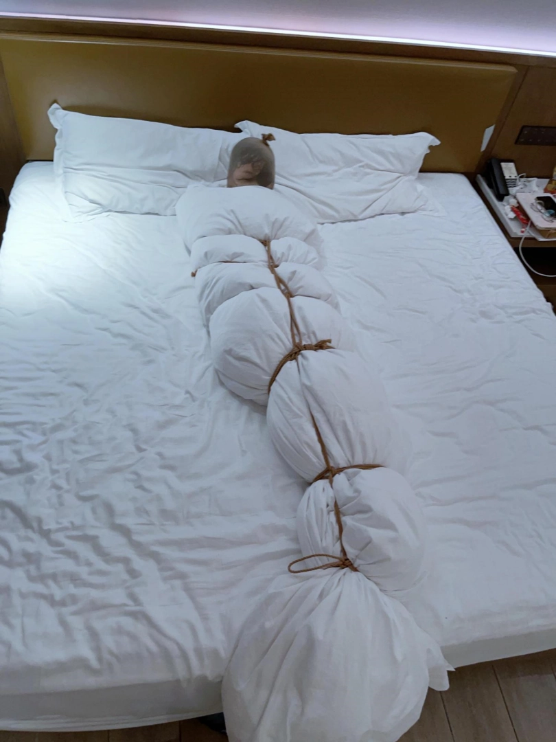 然后开始兴奋——妹子开始在里面夹腿自嗨,并且艰难地用手指尝试触碰下面..(这段第一人称采访妹子不让写,总之挣扎蠕动,舒服的扭来扭去)“总之被包裹起来太无聊了,夹腿成了我在里面唯一的娱乐方式,提醒我还作为人清醒着”