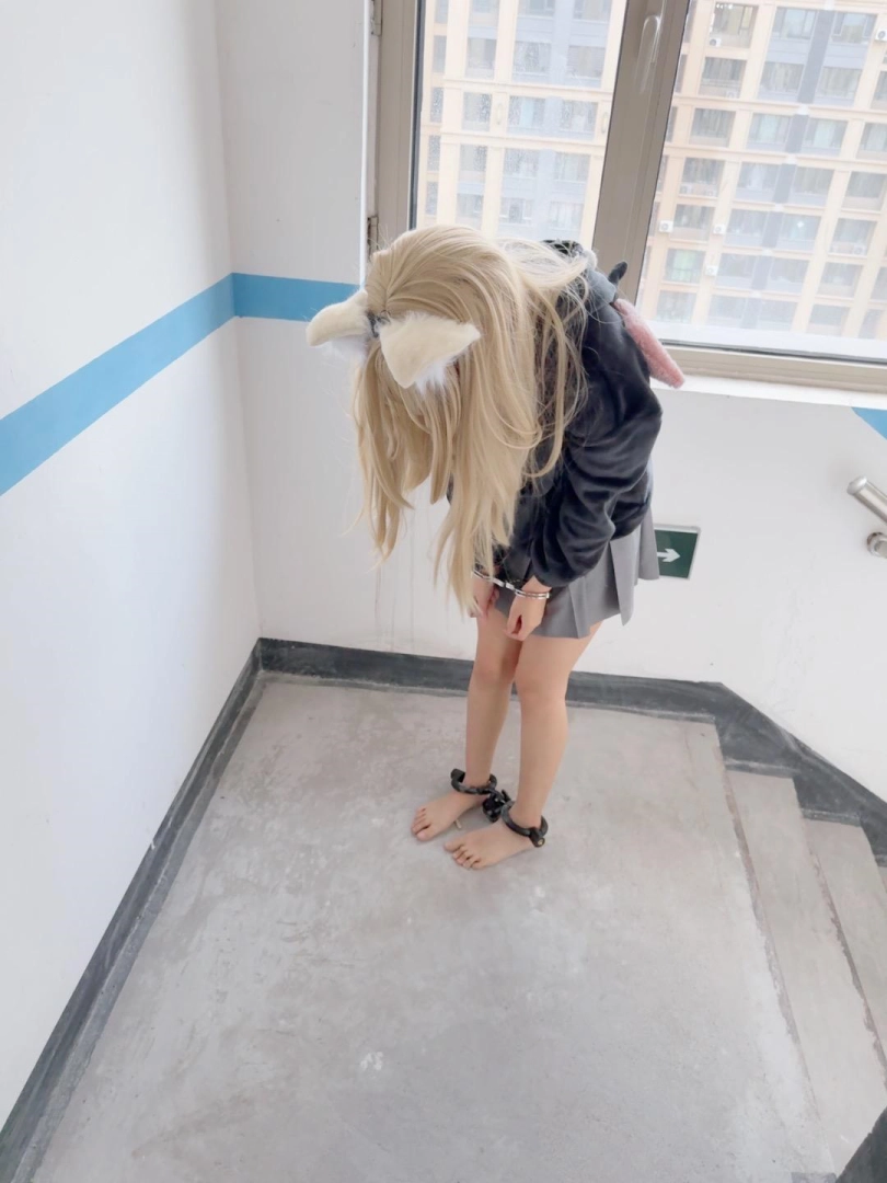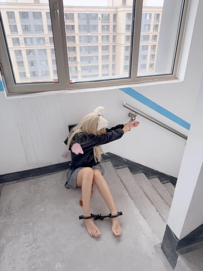 把赤脚裸足塞着[X_X]的小猫娘铐在小区楼梯间里!赤脚带着脚镣,一只手用手铐锁在楼梯间扶手上,逃跑不能,被迫在半公开的环境下被镣铐锁着!楼上有个送快递的大哥一直在扫包裹,楼下有个小哥在楼梯间抽烟~我们在中间紧张死了,一会一阵脚步声,一会一个咳嗽声....别说妹子了,我都有点心跳加速了!妹子更是特别着急,中间一直在尝试脱出镣铐~笨蛋,怎么可能脱的下来啦23333~