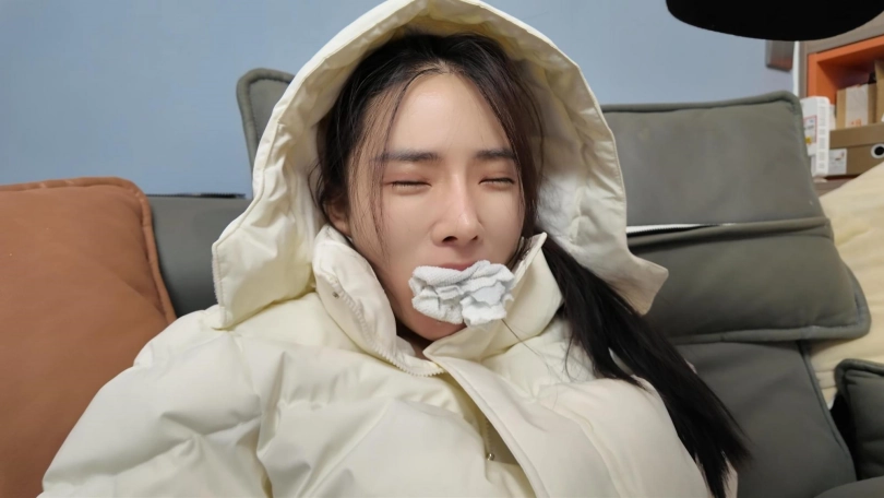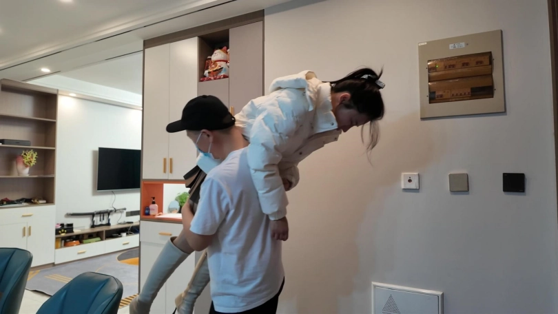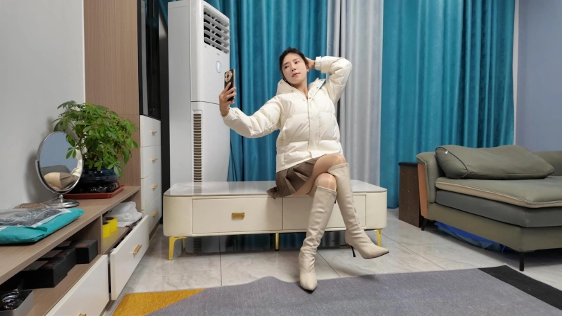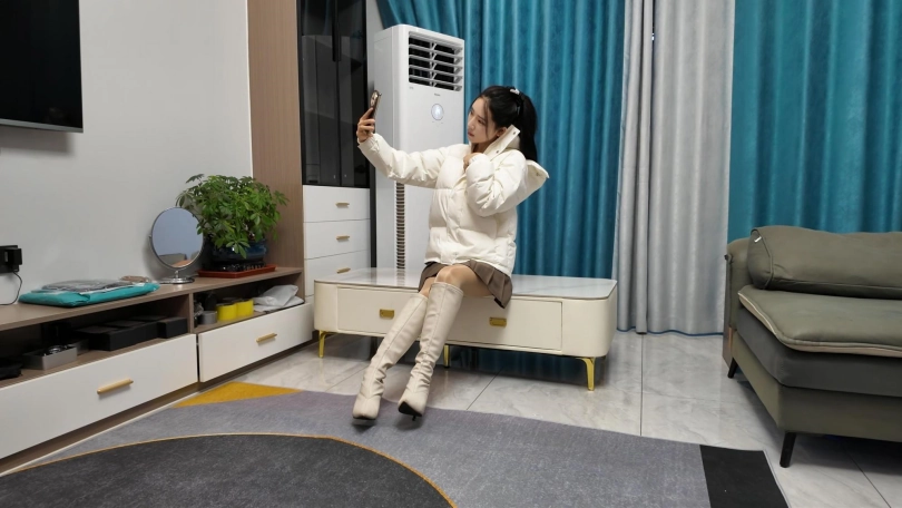 服装模特在家自拍刚到的服装,各种姿势自拍,拍完整理好衣服出门,被早已藏好的歹徒捂晕,扛到沙发上,捆绑,堵嘴,脱掉靴子,各种抚摸