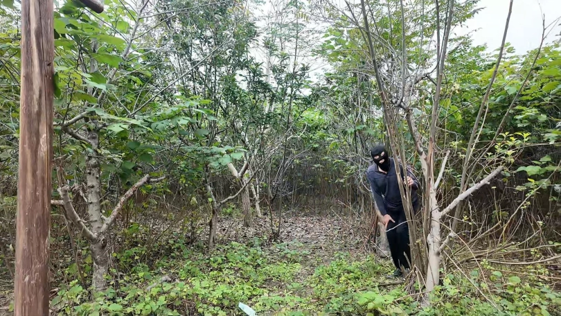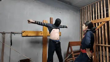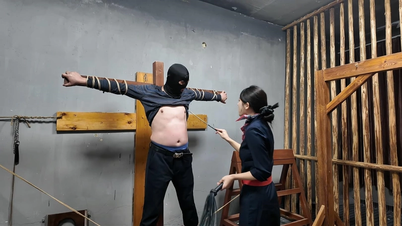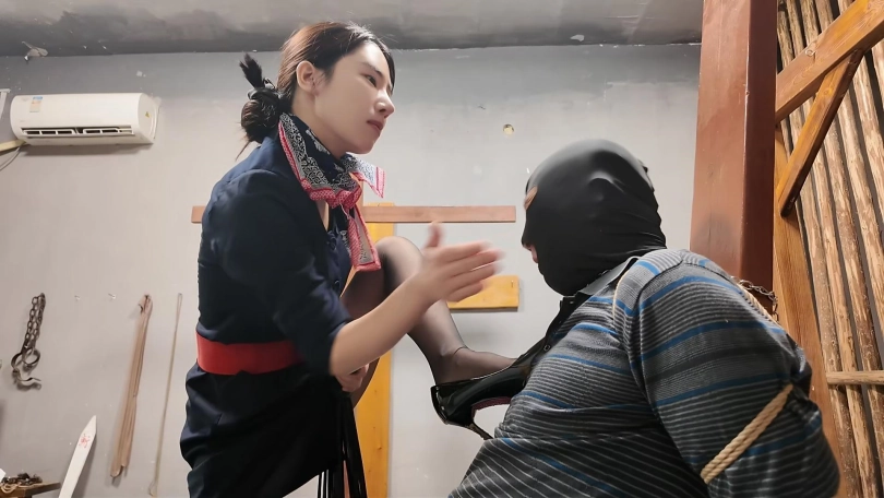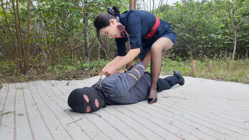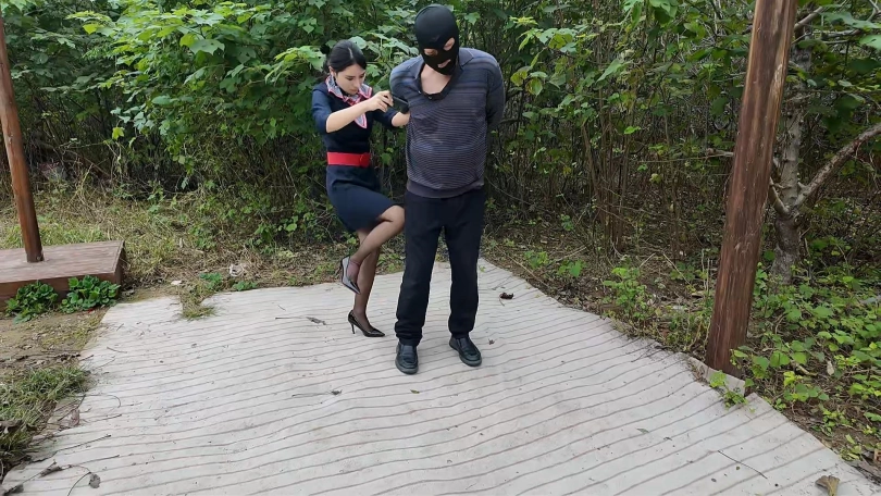 女侦探十一化妆成空姐,抓捕逃犯,在树林里发现逃犯张三在树后面躲藏,抓捕后五花大绑,押解到刑房审讯,皮鞭,高跟鞋,骑脖子,耳光、各种羞辱惩罚不断,最后押解到刑场执行枪决