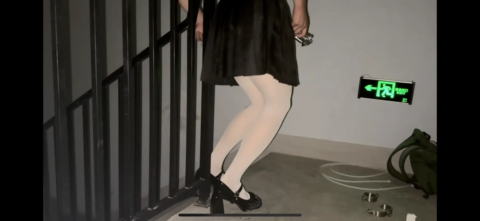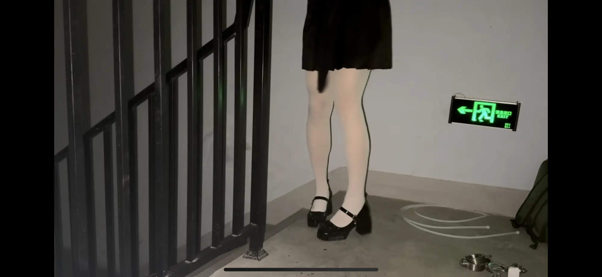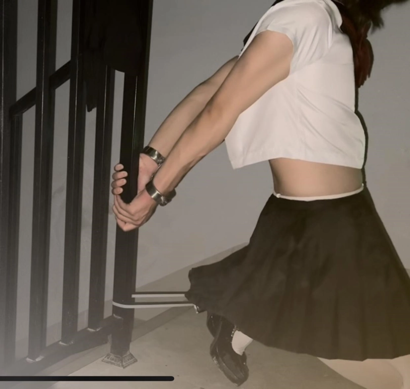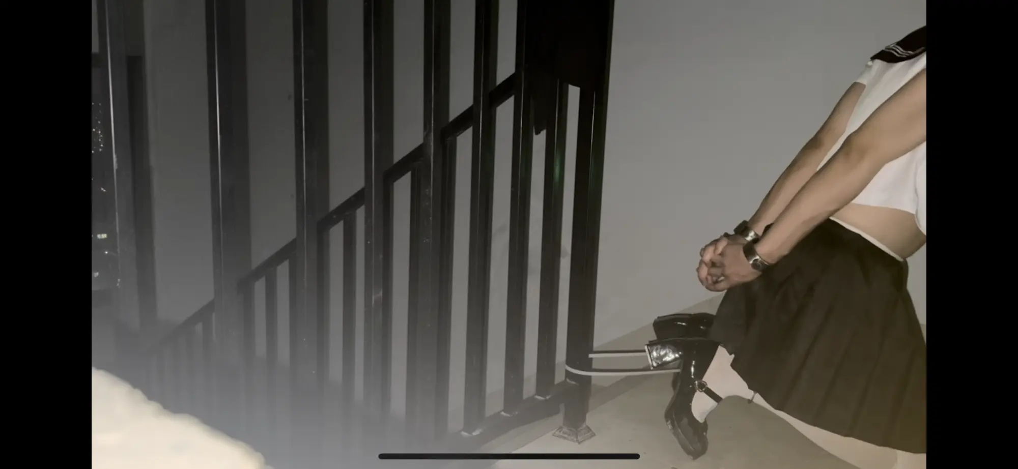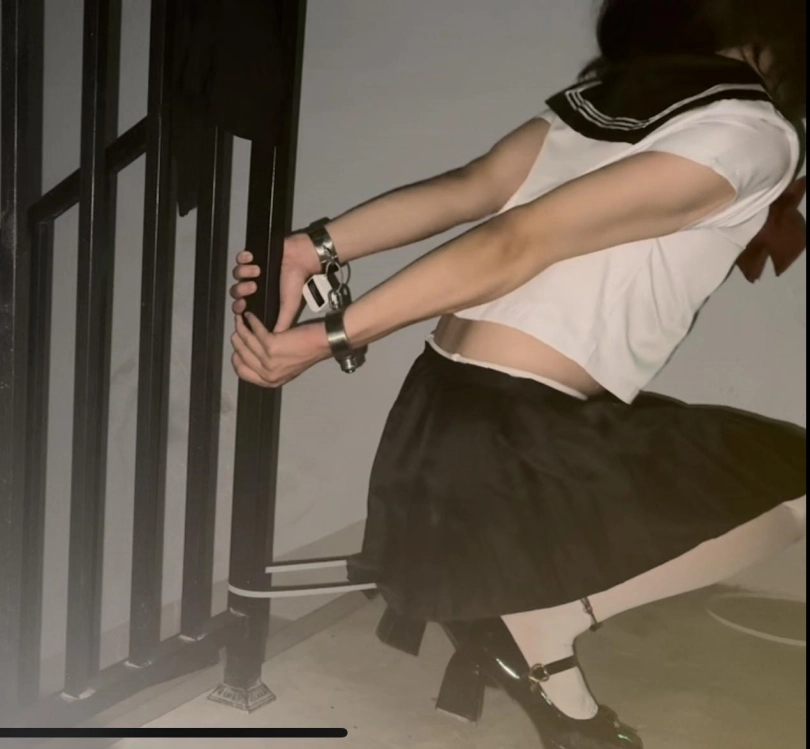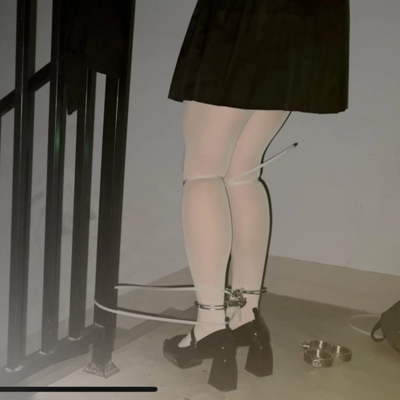 这次是在小区楼道里自缚!用两副手铐和一个定时锁,再用扎带把活动范围限制在这一小块地方内。先把黑丝脱掉换成白丝,然后铐住双脚(这个本来就是手铐,用它来铐我的脚踝非常勒得慌,稍微动一动就会很疼!!),然后用扎带和栏杆连接在一起,最后再用定时锁定号时,把两个手铐连接在一起,反手铐住双手后就再也没有回头路了,只能等定时结束之后再解缚,如果定时所出问题的话,真的一点办法都没有,这个距离我也够不到放在一旁的包里面的钥匙!!