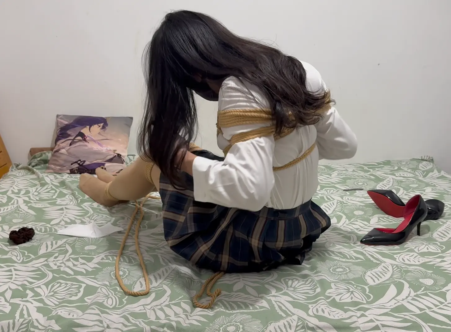 这次日式可以当做教程看看,正面背面镜头都有,后面手腕的捆绑可以绕过背面一堆绳子做一个吊着的收紧的绳圈,我这个绳头留的不够了所以没做收紧就直接八字绕环了了(事实证明不容小觑,原计划三十分钟但竟然搞了五十分钟啊啊啊啊啊)