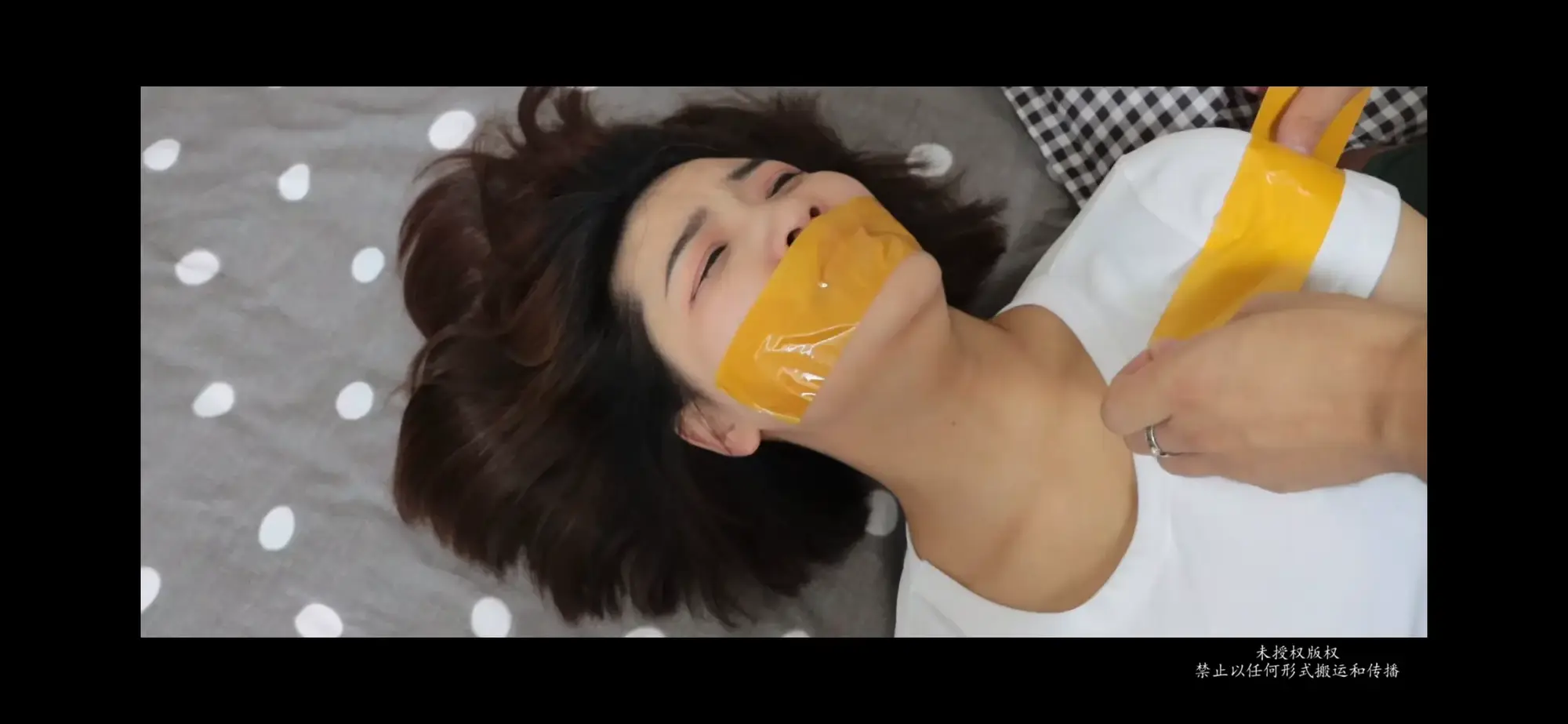 剧情一:刘芳下班回家,在门口附近被尾随,小七捂住她的嘴挟持着她,用黄色胶带捆住她的手腕在体前,把她扔到床上。这时刘芳说着要报警,把小七激怒。拿起事先准备的黄色胶带一点一点的粘住她的面部(粘到眉毛下方)让刘芳不能呼吸。随着氧气一点一点的耗尽,刘芳挣扎的也越来越厉害,小七按住她的手腕举过头顶,刘芳两腿挣扎渐渐放下,被活活闷死。