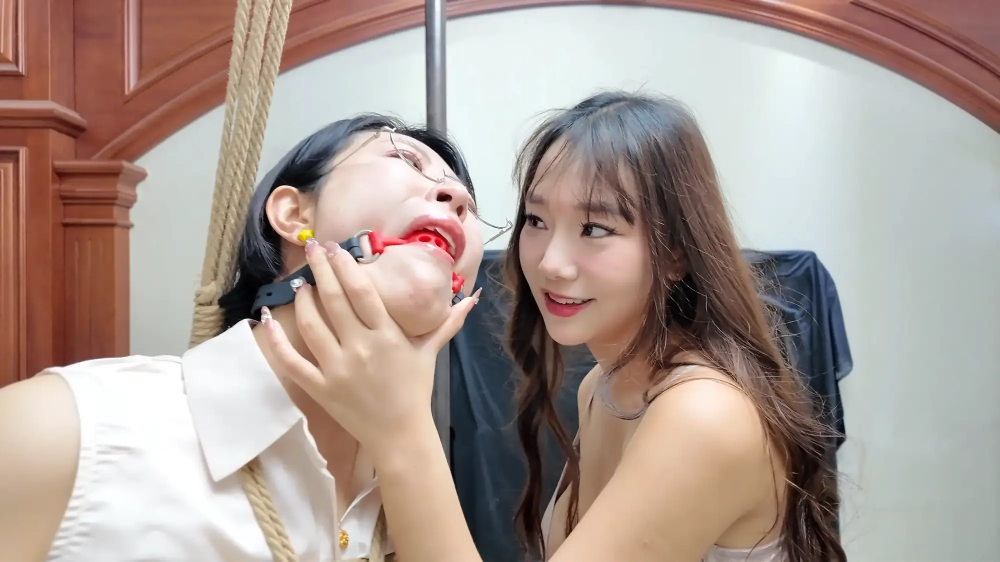 出轨的渣男丈夫沉沦美色,每日在自己的家中与老婆的闺蜜小米缠绵,半个多月过去,小米发消息告诉丈夫自己还有一周回来,丈夫为了保险起见,让小雯不要继续住在家中,谁知小雯竟为此吃醋发小脾气,作为小三渣男丈夫自然也是懒得应付,随便找了个理由便出门了,并告知小雯尽快收拾东西离开,发现闺蜜丈夫只是看上自己美色的小雯气急败坏,偶然看到闺蜜小米的睡衣,便穿在身上在镜子前端详自己。这时小米已经来到家门口,原来她为了给丈夫一个惊喜所以骗他自己还有一周才会回家,进了家门后小米呼喊丈夫,被浴室中的小雯听到,小雯不仅没有慌张反而是对着自己的手机坏笑了起来,她走出门叫住了小米,小米质问小雯为什么穿着自己的睡衣,小雯一阵嘲讽后亮出了手机中偷情的照片,小米一气之下与小雯扭打起来,最终小米不敌小雯被掐晕,醒来后自己已经被小雯单腿吊缚。