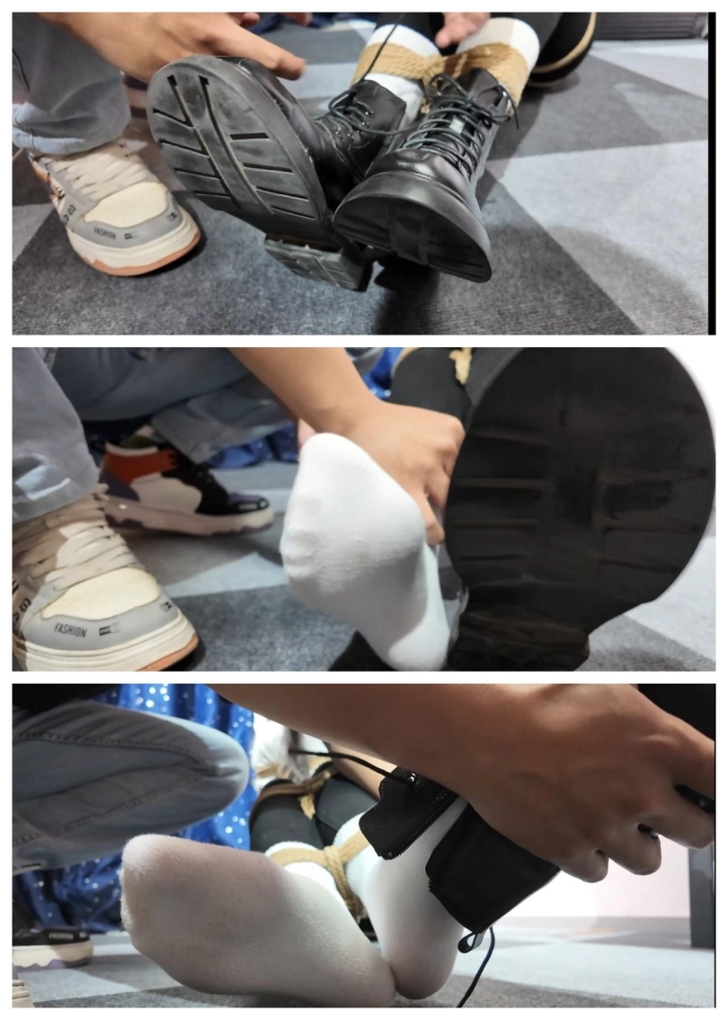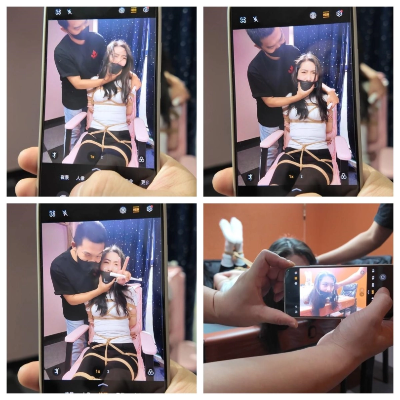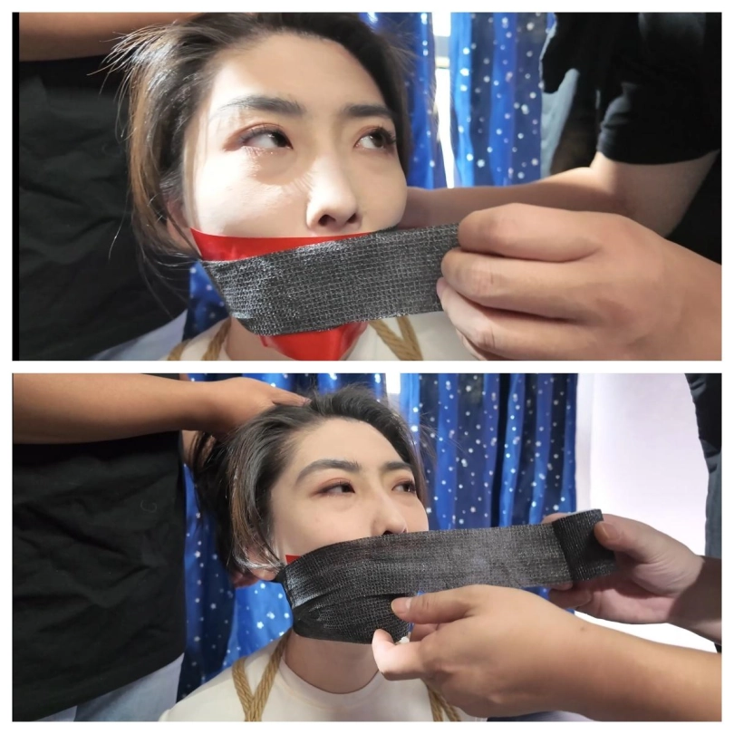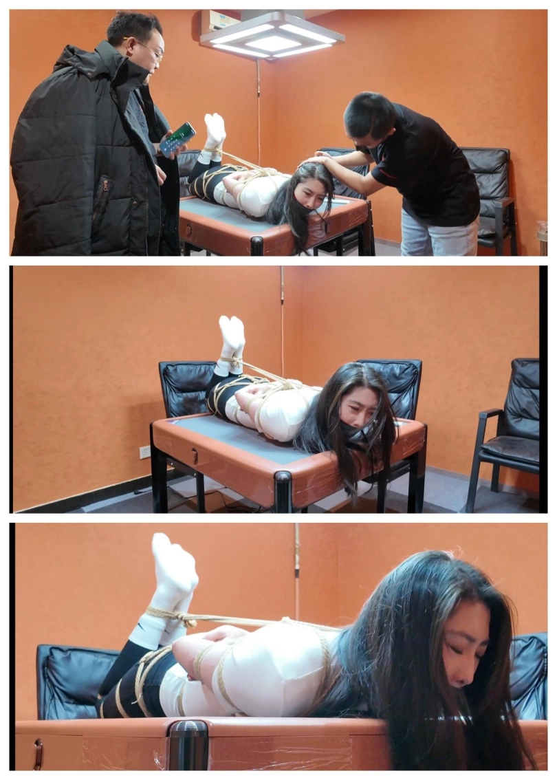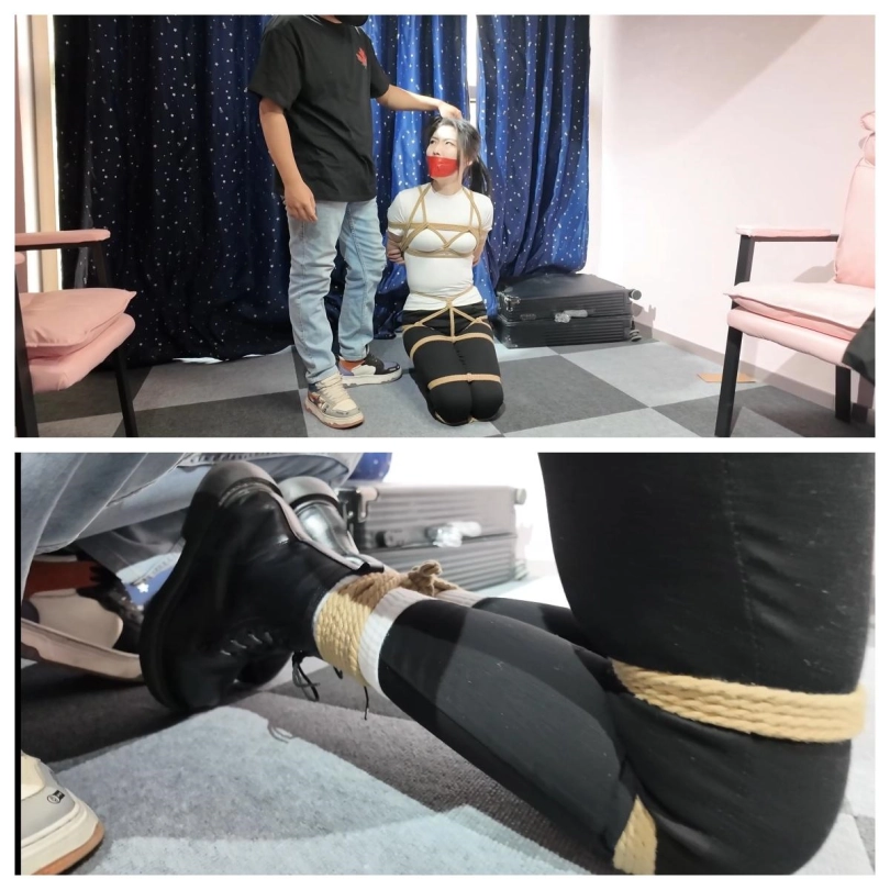 面对新一轮挠痒痒折磨,雨诺只能尽力的呜呜呜含糊不清地向二人求饶,可能让二人停下来的只有他们自己累了!玩弄了一会,二坏蛋累了,停止了对雨诺的挠痒痒,但并不打算让雨诺踹口气!眼镜坏蛋搜出了雨诺的手机,然后让口罩坏蛋去控制雨诺,他则给二人拍照,拍完雨诺被捆绑堵嘴的照片后,二人将雨诺捆成驷马倒攒蹄放置在麻将桌上,然后又将雨诺被驷马倒攒蹄结实捆绑照拍了下来,将这些照片打包发给了雨诺的搭档柠琪,并发文说到:你好搭档在我们手上,收到消息后将那个小骚货的女儿给我们绑来!不然我们就把你的美女搭档给做了!拍完照片,二人再次检查了雨诺身上的绳子是否结实后,离开房间,留被驷马倒攒蹄结实捆绑的雨诺在麻将桌上挣扎并发出呜呜呜呜声音。