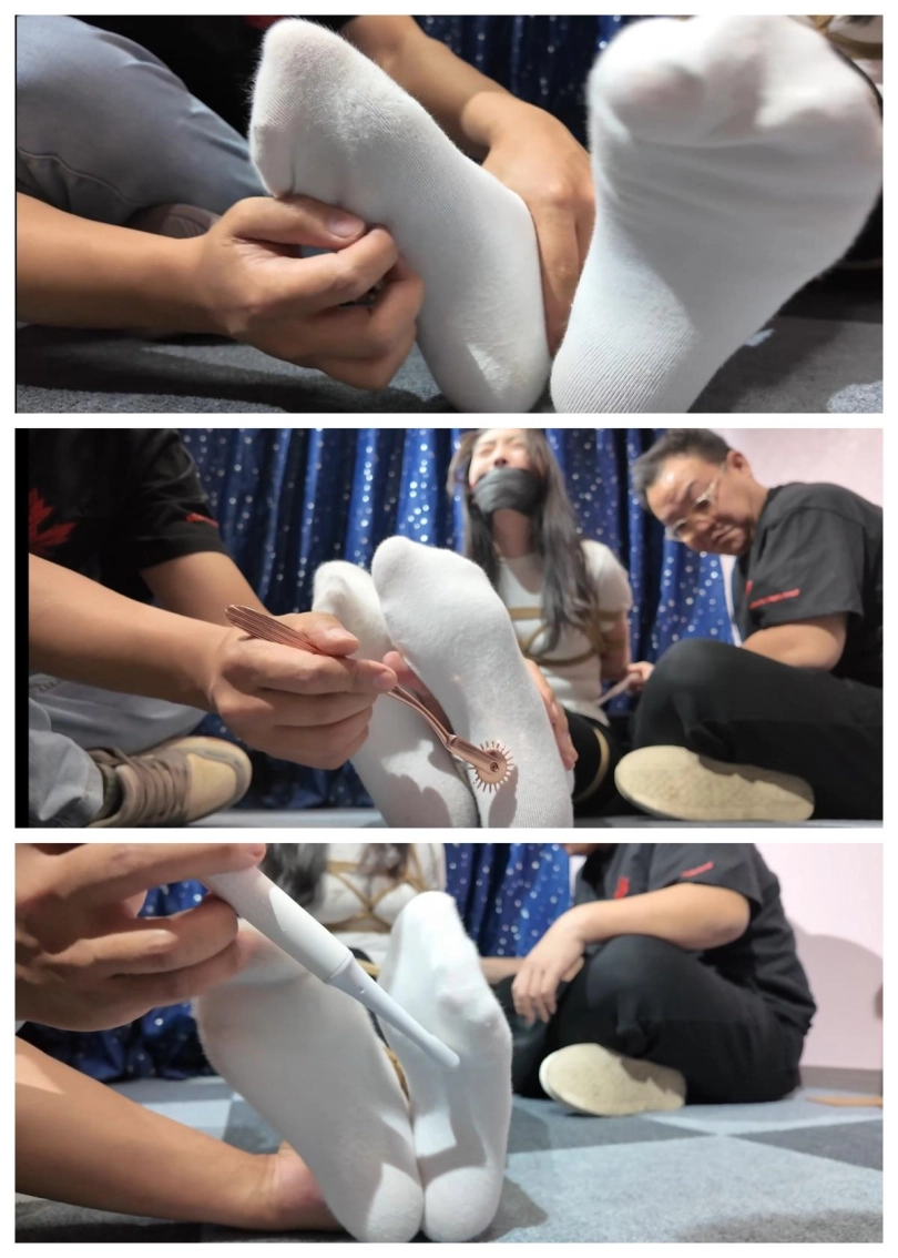 剧情介绍:接“不劳而获•大绑特绑(第二集)”,故事开始,两名坏蛋正在巢穴悠然自得的喝着茶聊着很龌蹉的话题,镜头一转,探清虚实的女保镖雨诺偷偷摸进了房间(剧情和第二集接上了,推荐大家从第一集开始看起)。进入房间的雨诺小心翼翼的摸着搜索情况,可她那里知道,她的一举一动都在坏蛋的监控下!镜头再次给到两坏蛋,口罩坏蛋看着雨诺的举动满脑子就想着快点去把她给解决了,而眼睛坏蛋坏点子比较多,提议让自己假装大声说话吸引美女雨诺注意,虽然让口罩坏蛋前去偷袭,要抓活的!一拍即合,二坏蛋就按照计划行动。此时雨诺被眼镜坏蛋大声说话的声音吸引,来到房间门口观察着,只观察屋内的情况,却没发觉有一只黑手已经向她靠近!摸到雨诺身后的口罩坏蛋不费吹灰之力就把雨诺制服,抓获!然后用枪顶着雨诺的头部,让雨诺高举双手像个俘虏一样往眼镜坏蛋处走去,来到眼镜坏蛋跟着,眼镜坏蛋说到:给我跪下!雨诺骂到:我才不跪你们这些混蛋呢!眼镜坏蛋见雨诺不知好歹,跟口罩坏蛋说到:让她跪下!口罩坏蛋立马上前往雨诺的膝盖处就是一脚!剧烈的疼痛要雨诺膝盖弯曲,让她只能跪下地上!虽然口罩坏蛋又说到:给我双手抱头!不然就一枪打死你!雨诺照做,然后眼镜坏蛋走上前,问她道:快说出你同伴的位置,我可以考虑放了你!雨诺说到:你做梦吧!我是怎样都不会说的!眼镜坏蛋说跟口罩坏蛋说到:别跟她废话了,先把她绑起来,我有办法收拾她。随后将绳子抛给口罩坏蛋,雨诺拼命挣扎,可不是两个坏蛋的对手,被两坏蛋制服并结结实实的捆绑起来!镜头一转,雨诺被捆绑在地上,眼镜坏蛋将一双袜子揉成团,然后口罩坏蛋一只手摁住了雨诺的头,一只手将雨诺的嘴巴捏开张到最大,然后眼镜坏蛋将袜子揉成一团往雨诺的嘴里塞!将雨诺嘴巴塞满后,又在雨诺嘴巴上封了三张红色胶带,被堵嘴加封嘴的雨诺只能呜呜呜的叫着,即便如此,眼镜坏蛋还觉得雨诺的“呜呜呜”声太大,于是拿来了黑色绷带,让口罩坏蛋扯住雨诺的头发,让她抬头,然后眼镜坏蛋用黑色绷带将雨诺嘴巴紧紧缠绕住!雨诺的呜呜呜声逐渐变小。(堵嘴封嘴过程有特写)捆绑堵嘴完后,两坏蛋觉得好久没得玩弄美女了,这送上门的一个可得好好玩玩!于是,口罩坏蛋解开了雨诺的鞋带,拉下拉链,把雨诺脚上的马丁靴脱了下来,露出一双厚棉白袜!(此处有脱鞋及棉白袜特写)露出白袜后,由口罩坏蛋负责雨诺脚心的挠痒痒,眼镜坏蛋负责挠雨诺腰上的痒痒!二人分工合作单单只是用手就把雨诺挠得受不了!随后二人觉得手还不够劲头,还用起了道具(电动牙刷,小齿轮,细铁丝)对着雨诺的脖子,腰子,脚心等敏感部位就是一顿挠!把雨诺折腾得呜呜呜呜并费力挣扎,可手脚被捆绑结实,嘴巴又被严密封堵的雨诺,除了呜呜呜叫和扭动身子外还能做些什么呢?在地上挠得不过瘾的两坏蛋又想了个损招,让雨诺跪下椅子上,然后接着挠她!