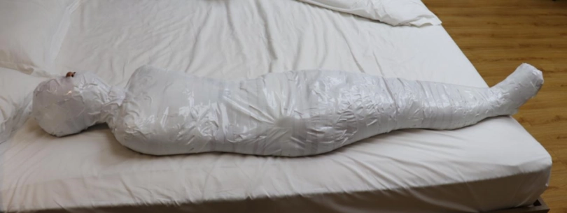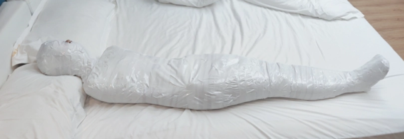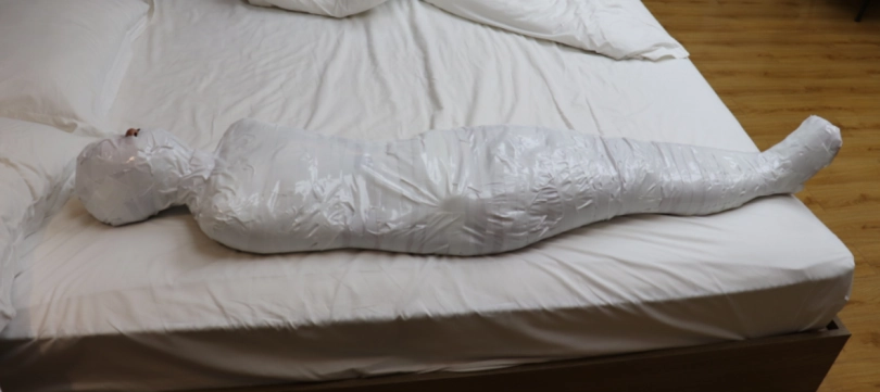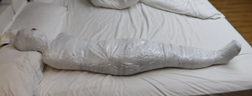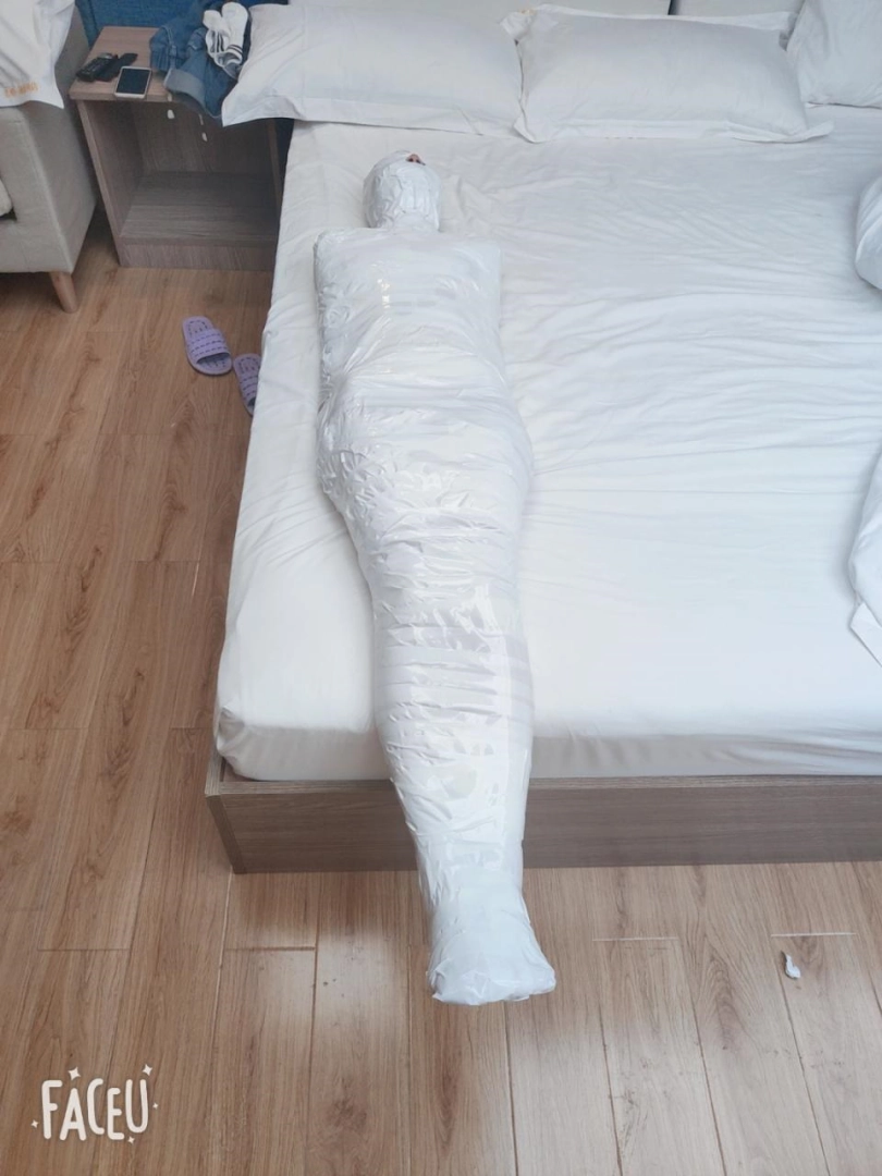 这次的挑战内容是:先用保鲜膜缠绕打底,然后用白色的布基胶带把轻酱包成木乃伊哦。