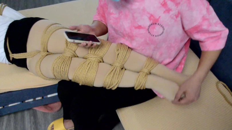 然后弟弟拿出一条棉绳,把沐子双手拉到后面,在沐子的手腕绑了。弟弟在从沐子的脚裸、小腿、膝盖上下给大腿。
