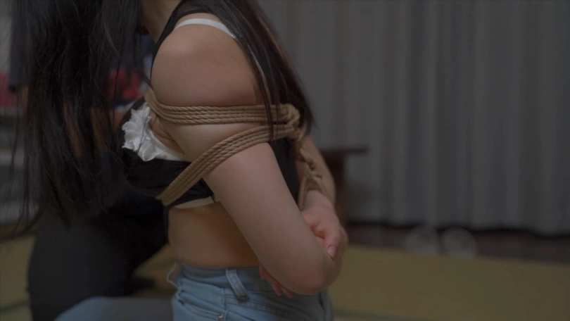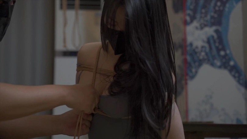 时不时的对女M胸部和下面抚摸抓揉,两人要不同的胸前绑法,要紧一些,脱下裤子漏出内裤上股绳。