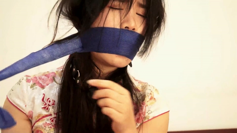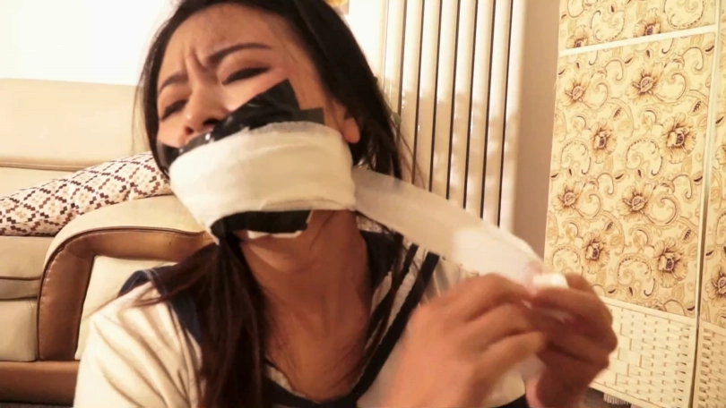 第3段:逃脱未遂惨遭劫匪二次捆堵驷马封眼的吴晗不知挣扎了多长时间,终于弄松绳结挣脱捆绑。吴晗坐在床上慢慢撕开封眼蓝色自粘绷带和粉色静电胶带,适应光明后撕开封嘴自粘绷带,拽出口中劫匪送给她的“礼物”——一条已经湿漉漉的黑色连裤丝袜,吴晗厌恶地看了看,仍掉了塞嘴丝袜,下地去报警。